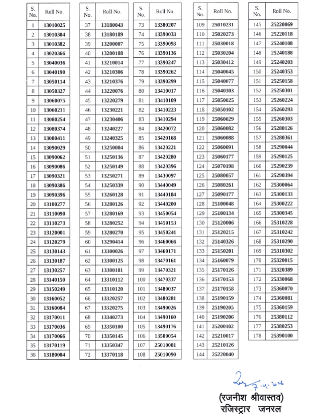 उक्त पात्र पाये गये कुल 178 अभ्यर्थियों का अनुक्रमांक (व्यापम, रायपुर द्वारा लिये गये प्रथम स्तर की लिखित परीक्षा में दिये गये अनुक्रमांक अनुसार) निम्नानुसार है-